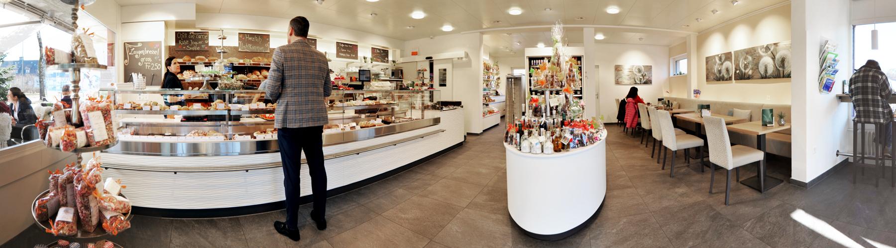 Verkaufsbereich im Laden Neben unseren beliebten Backwaren, Snacks und Pâtisseries, stehen zur Deckung des täglichen Bedarfs auch Getränke, Milchprodukte, hausgemachte Menus und weitere Lebensmittel zur Verfügung.